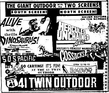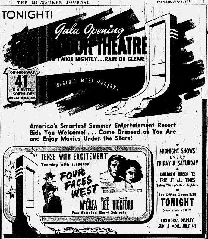 The 41-Twin was originally called the 41 Outdoor Theater when it first opened on July 1st, 1948. The theater had only one screen at the time. The second screen was added in either 1949 or 1950. This was the second drive-in theater to open in the Milwaukee area. Only the Bluemound drive-in appears to have opened earlier. The 41 Twin used to operate some years until after Christmas and even some years was open all year around. It depended upon the weather conditions of the year. The 41 Twin used to have in-car heaters available for people to use during the winter months. They were small metal boxes with heat coils and fans to heat the interior of your car. The heaters would plug into the 220 volt plugs that were on the speaker poles. Most of the speaker poles at the 41 Twin still have these plugs on them.