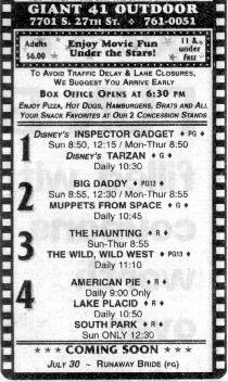 August 20, 1999: Yet another trip to the 41-Twin. Inspector Gadget and The Sixth Sense were the double feature of the night. Being near the airport, there was quite a bit of air traffic including a small passenger plane came in right over the screen.