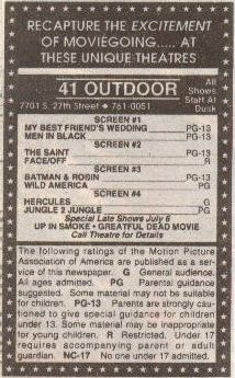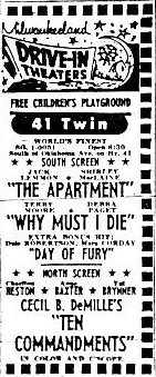 May 29, 1999: Went to the 41-Twin to see The Mummy and Patch Adams. They've done some improvements to the theater. They've done some painting and have the concession stands looking nice again. There was a good size crowd and the weather was perfect for outdoor movie watching. The sky was clear and there was a full moon. The price for admission is $6.00 per person for two first-run movies.