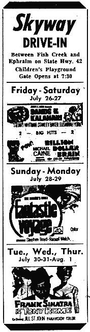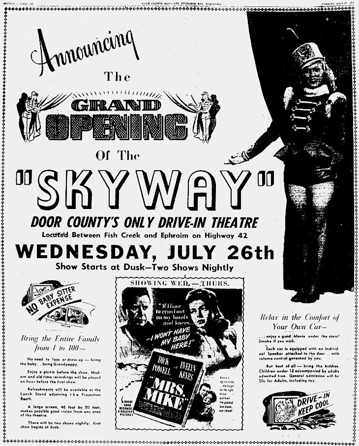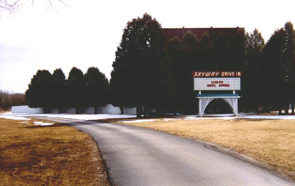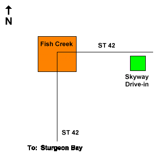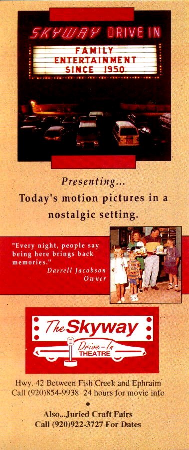 The Skyway Drive-in theater is a small, but very nice drive-in located near Fish Creek in Door County. I made it up to this one a couple of years ago to see "Independence Day" and "The truth about Cats and Dogs". You have a choice of FM radio and the original window speakers! One of the local TV stations, channel 26, interviewed the owner last summer. He said that as long as they keep making movies, and people keep coming to Door County, the Skyway will remain open.